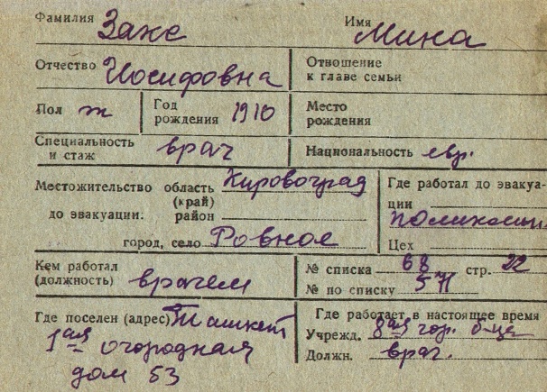 Mina Zaks was born, 1910 to Iosif. Prior to WWII she lived in Rovnoye, Ukraine (USSR). During the war she was in Uzbekistan (USSR). Mina was registered following the evacuation/ in the interior of the Soviet Union.