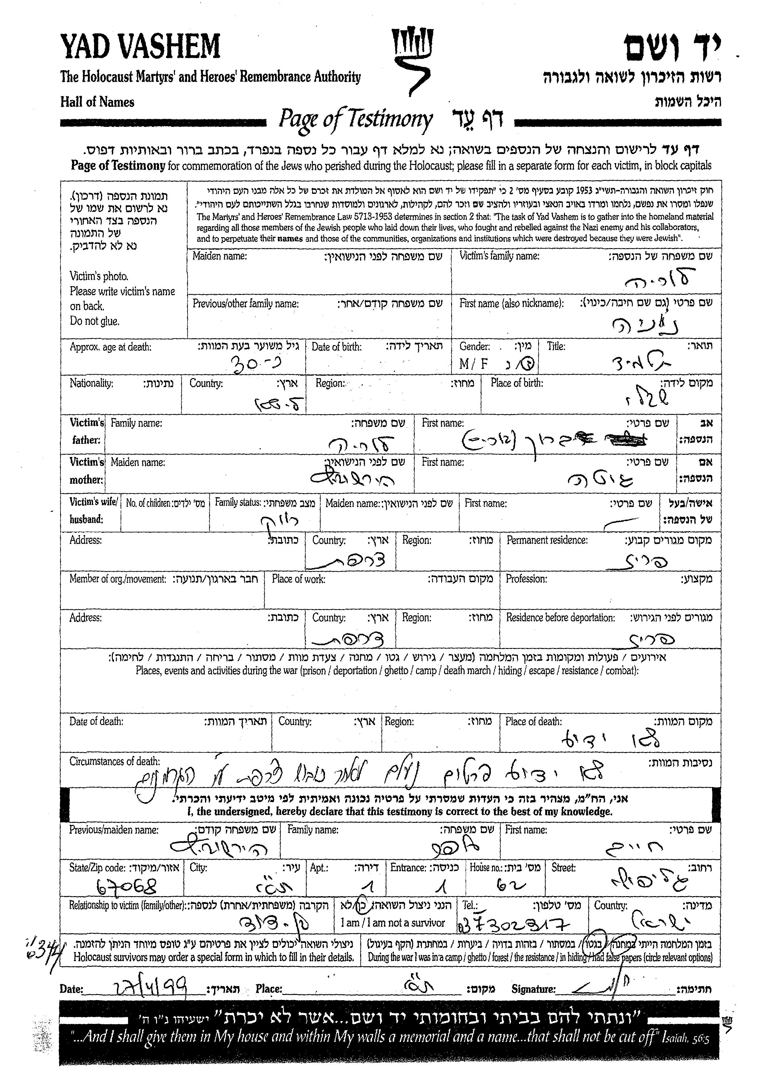 Yad Vashem - Pages of Testimony Names Memorial Collection