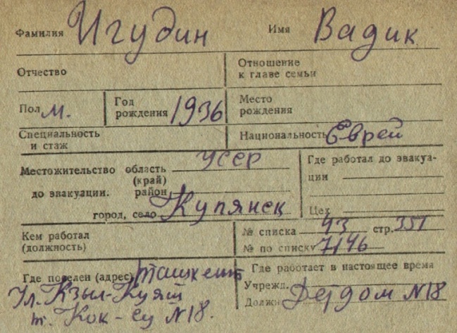 Vadik was registered following the evacuation/ in the interior of the Soviet Union.