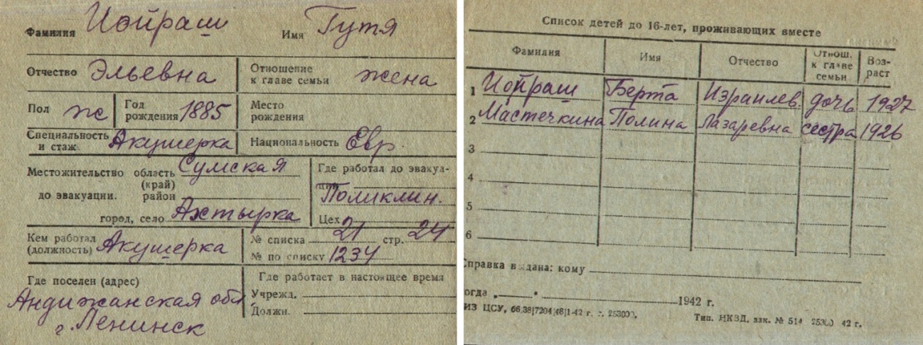 Gutya Ioyrash was born, 1885 to Eliy. Prior to WWII she lived in Akhtyrka, Ukraine (USSR). During the war she was in Uzbekistan (USSR). Gutya was registered following the evacuation/ in the interior of the Soviet Union.