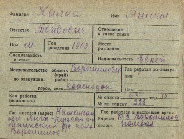 Mikhail Kalka was born, 1903 to Toyvo. Prior to WWII he lived in Krasnodon, Ukraine (USSR). During the war he was in Uzbekistan (USSR). Mikhail was registered following the evacuation/ in the interior of the Soviet Union.