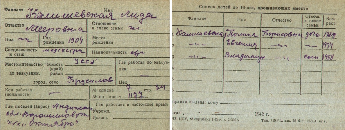 Lida Kalishevskaya was born, 1904 to Meyer. Prior to WWII she lived in Brusilov, Ukraine (USSR). During the war she was in Uzbekistan (USSR). Lida was registered following the evacuation/ in the interior of the Soviet Union.
