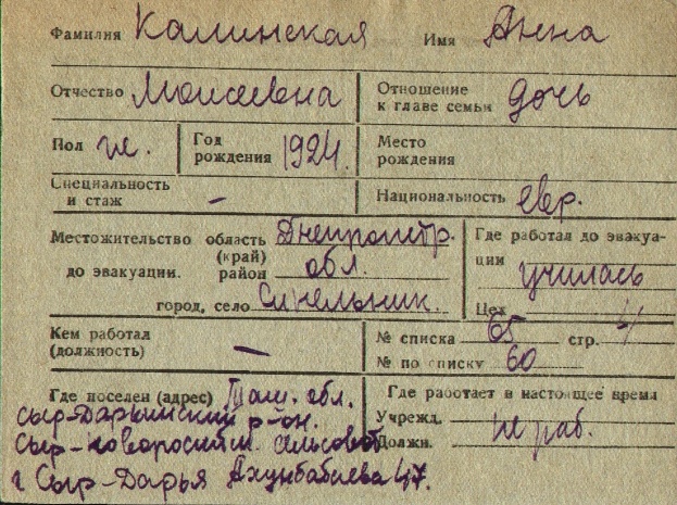 Anna Kalinskaya was born, 1924 to Moisey. Prior to WWII she lived in Sinelnikovo, Ukraine (USSR). During the war she was in Uzbekistan (USSR). Anna was registered following the evacuation/ in the interior of the Soviet Union.