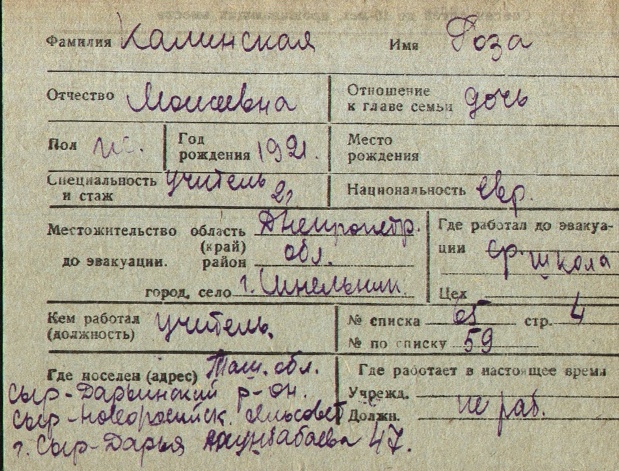 Roza Kalinskaya was born, 1921 to Moisey. Prior to WWII she lived in Sinelnikovo, Ukraine (USSR). During the war she was in Uzbekistan (USSR). Roza was registered following the evacuation/ in the interior of the Soviet Union.