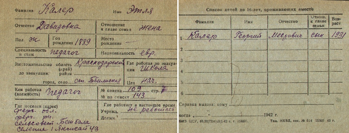 Etlya Kaler was born, 1889 to David. Prior to WWII she lived in Tbilisskaya, Russia (USSR). During the war she was in Uzbekistan (USSR). Etlya was registered following the evacuation/ in the interior of the Soviet Union.