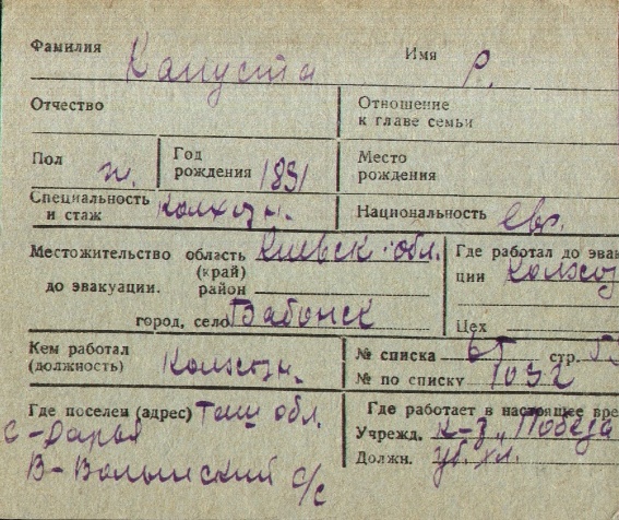 R Kapusta was born, 1891. Prior to WWII she lived in Babanka, Ukraine (USSR). During the war she was in Uzbekistan (USSR). R was registered following the evacuation/ in the interior of the Soviet Union.