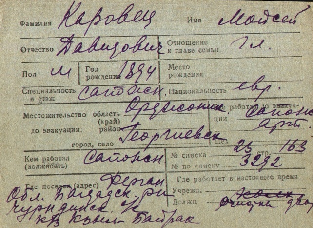 Moysey Karovetz was born, 1894 to David. Prior to WWII he lived in Georgiyevsk, Russia (USSR). During the war he was in Uzbekistan (USSR). Moysey was registered following the evacuation/ in the interior of the Soviet Union.