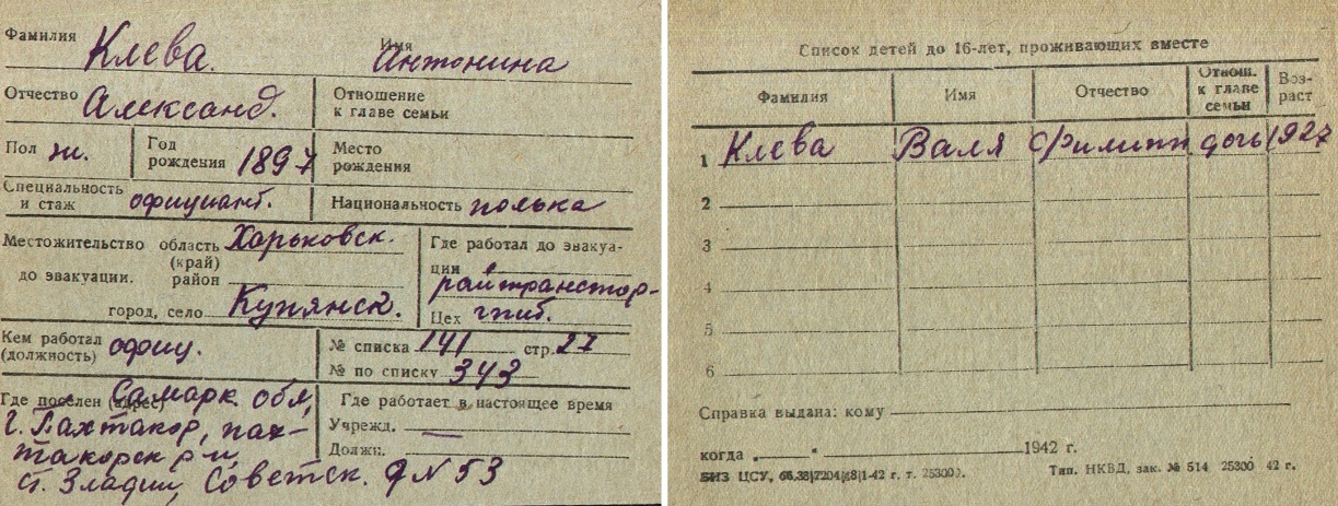 Antonina Kleva was born, 1897 to Aleksandr. Prior to WWII she lived in Kupyansk, Ukraine (USSR). During the war she was in Uzbekistan (USSR). Antonina was registered following the evacuation/ in the interior of the Soviet Union.