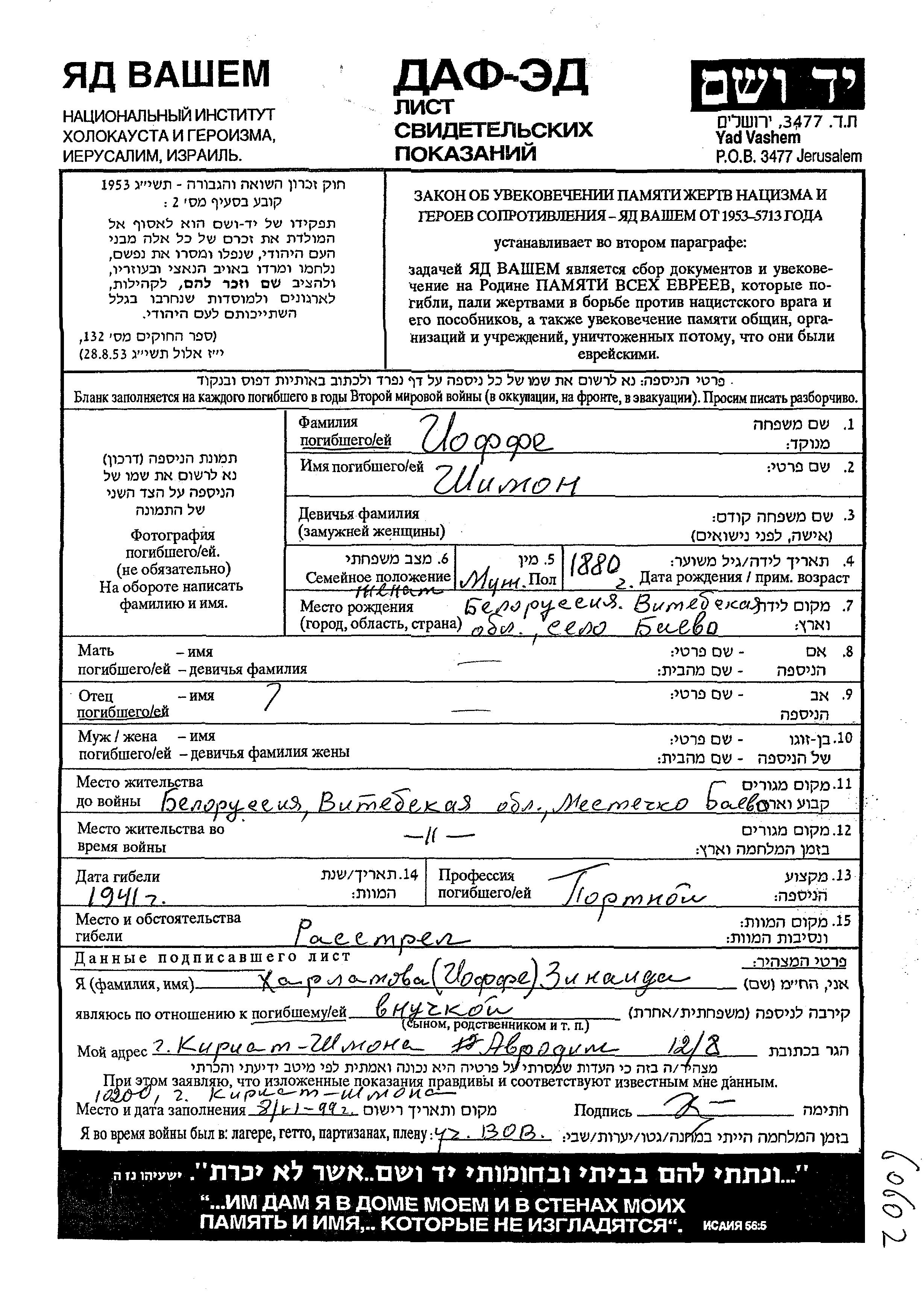Shimon Ioffe was born in Bayevo, Belorussia (USSR), 1880. He was married. Prior to WWII he lived in Bayevo, Belorussia (USSR). During the war he was in Bayevo, Belorussia (USSR). Shimon was murdered in the Shoah. Place of death: unknown, 1941.