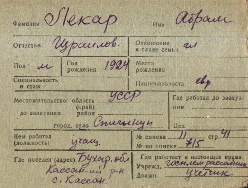 Abram Lekar was born, 1924 to Izrail. Prior to WWII he lived in Spichintsy, Ukraine (USSR). During the war he was in Uzbekistan (USSR). Abram was registered following the evacuation/ in the interior of the Soviet Union.