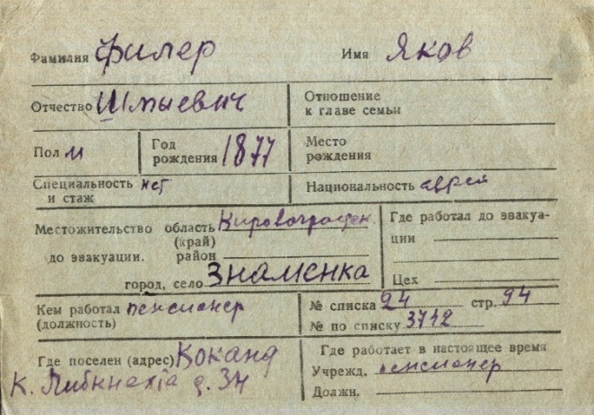 Yakov Filer was born, 1877 to Shmyi. Prior to WWII he lived in Znamenka, Ukraine (USSR). During the war he was in Uzbekistan (USSR). Yakov was registered following the evacuation/ in the interior of the Soviet Union.