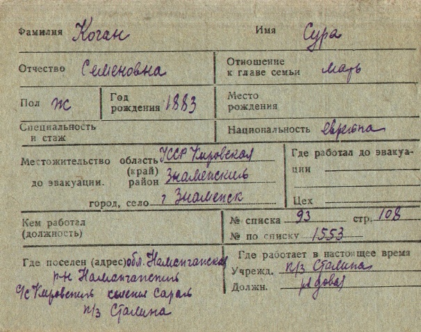 Sura Kogan was born, 1883 to Semen. Prior to WWII she lived in Znamenka, Ukraine (USSR). During the war she was in Uzbekistan (USSR). Sura was registered following the evacuation/ in the interior of the Soviet Union.