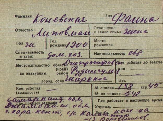 Faina Konevskaya was born, 1900 to Lipman. Prior to WWII she lived in Shirokoye, Ukraine (USSR). During the war she was in Uzbekistan (USSR). Faina was registered following the evacuation/ in the interior of the Soviet Union.