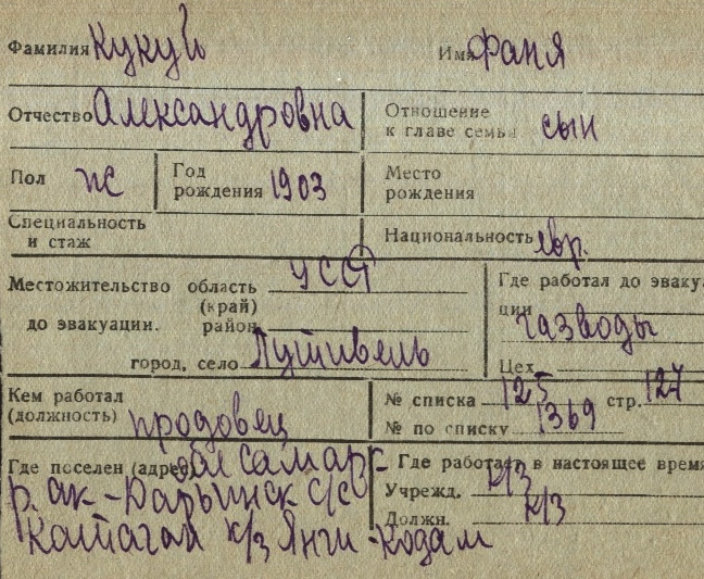 Fanya Kukuy was born, 1903 to Aleksandr. Prior to WWII she lived in Putivl, Ukraine (USSR). During the war she was in Uzbekistan (USSR). Fanya was registered following the evacuation/ in the interior of the Soviet Union.