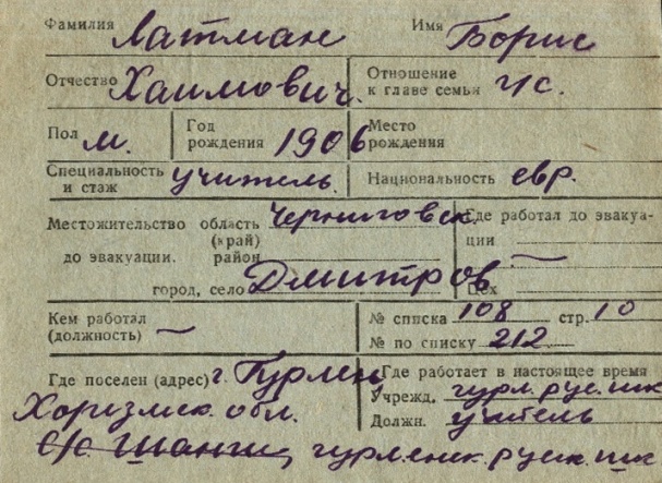 Boris Latman was born, 1906 to Khaim. Prior to WWII he lived in Dmitrovka, Ukraine (USSR). During the war he was in Uzbekistan (USSR). Boris was registered following the evacuation/ in the interior of the Soviet Union.