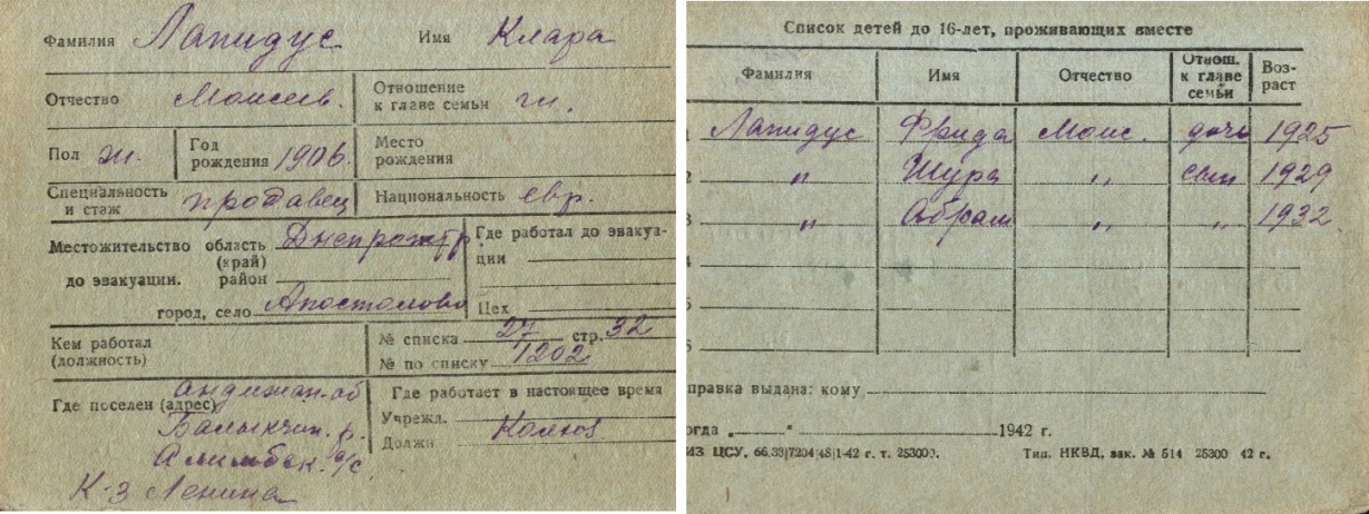 Klara Lapidus was born, 1906 to Moisey. Prior to WWII she lived in Apostolovo, Ukraine (USSR). During the war she was in Uzbekistan (USSR). Klara was registered following the evacuation/ in the interior of the Soviet Union.