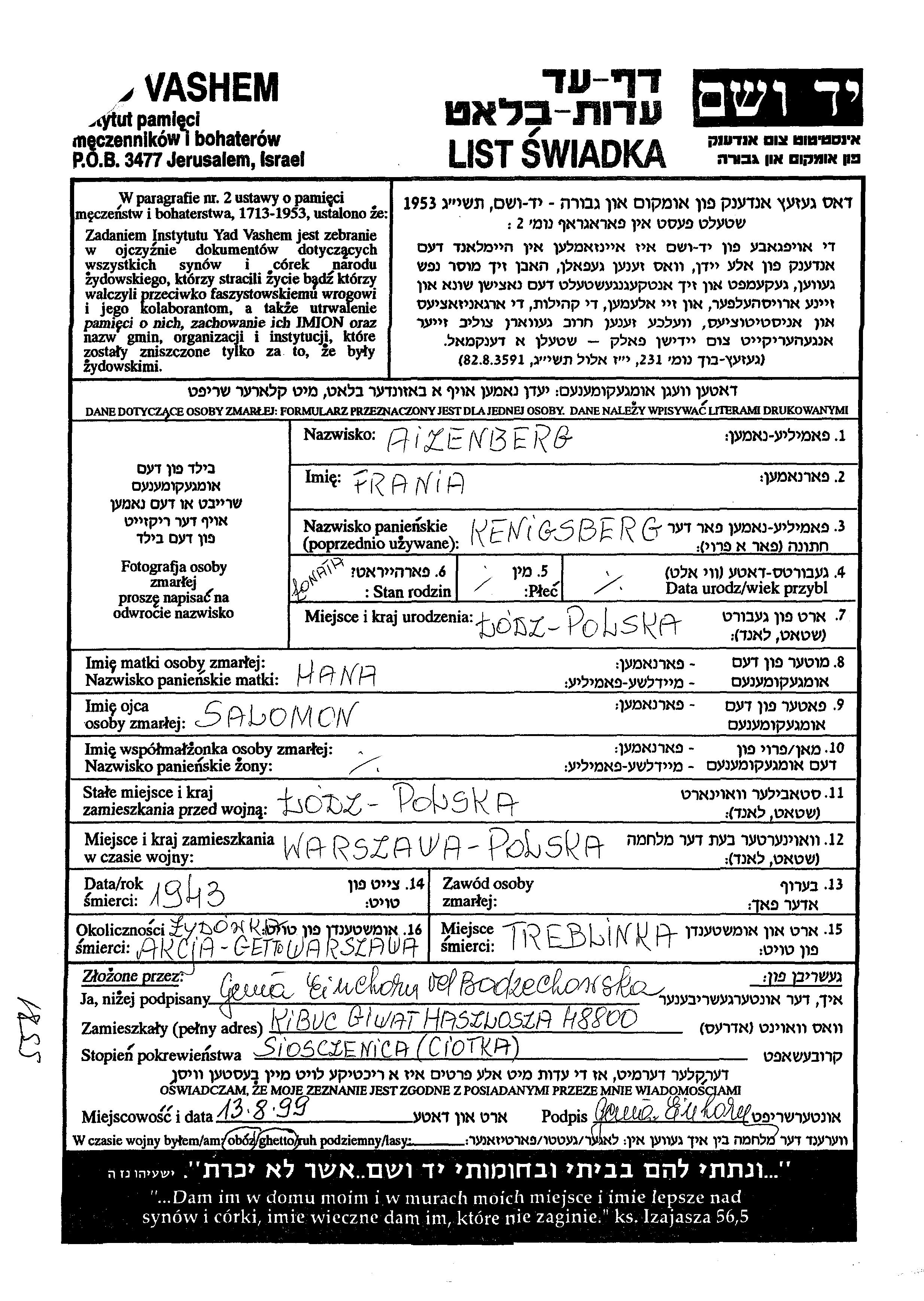Aizenberg Frania Lodz, Poland Page of Testimony