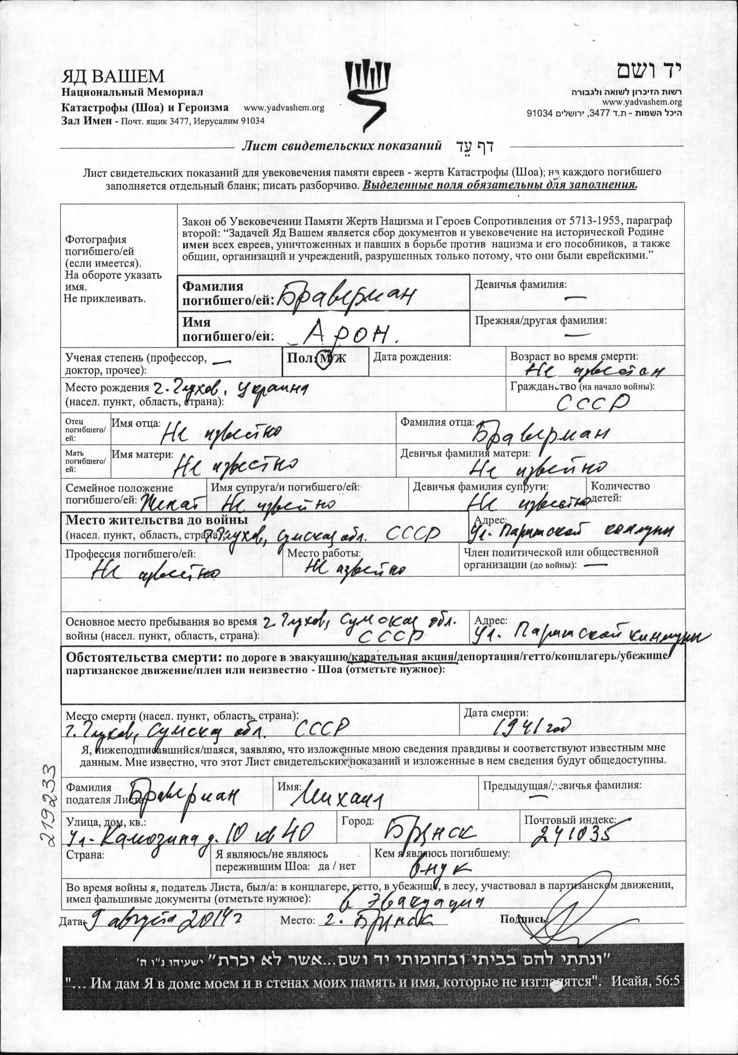 Aron Braverman was born in Glukhov, Ukraine (USSR) to First name unknown and First name unknown nee Surname unknown. He was married. Prior to WWII he lived in Glukhov, Ukraine (USSR). During the war he was in Glukhov, Ukraine (USSR). Aron was murdered in the Shoah. Place of death: Glukhov, Ukraine (USSR), 1941.