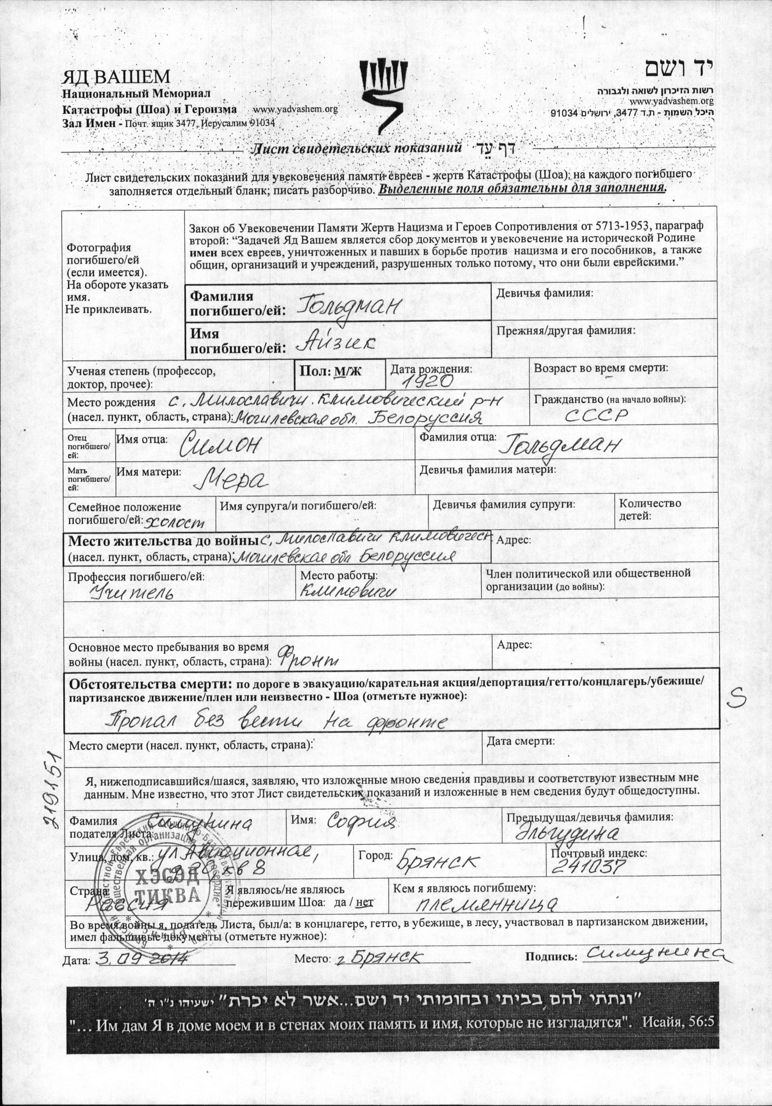 Ayzik Goldman was born in Miloslavichi, Belorussia (USSR), 1920 to Simon and Mera. He was a teacher and single. Prior to WWII he lived in Miloslavichi, Belorussia (USSR). During the war he was in Miloslavichi, Belorussia (USSR). Ayzik was murdered in the Shoah.
