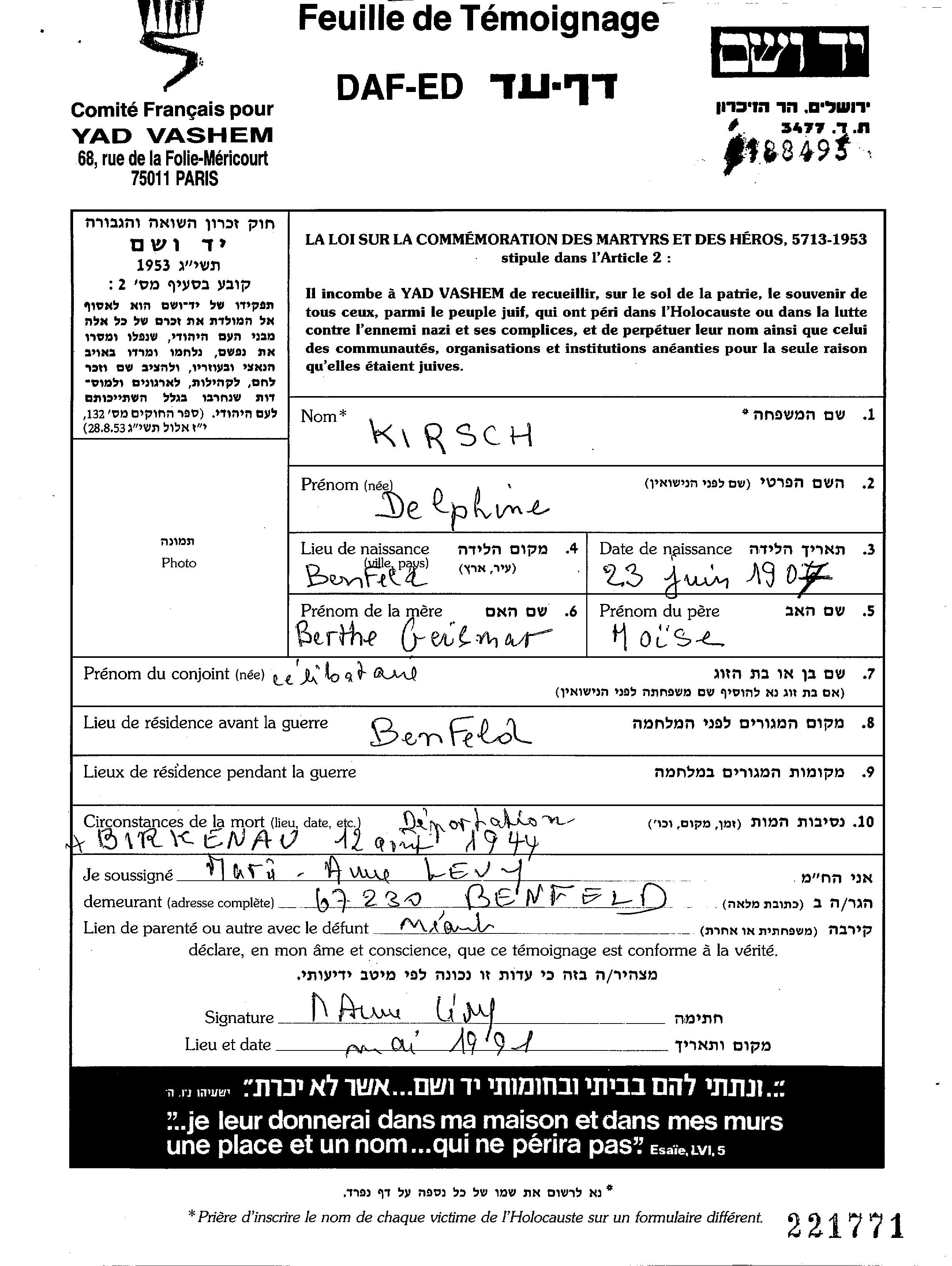 Delphine Kirsch was born in Benfeld, France, 1907 to Moise and Berthe nee Geismar. Prior to WWII she lived in Benfeld, France. Delphine was murdered in the Shoah. Place of death: Birkenau, Poland.