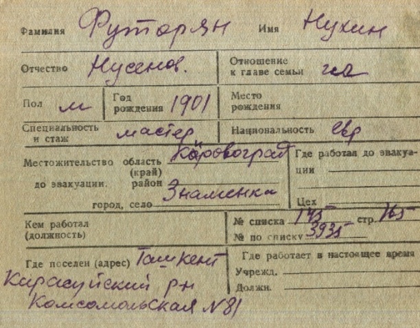 Nukhim Futoryan was born, 1901 to Nusen. Prior to WWII he lived in Znamenka, Ukraine (USSR). During the war he was in Uzbekistan (USSR). Nukhim was registered following the evacuation/ in the interior of the Soviet Union.
