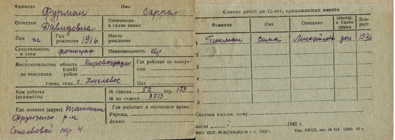 Sarra Furman was born, 1916 to David. Prior to WWII she lived in Khmelevoye, Ukraine (USSR). During the war she was in Uzbekistan (USSR). Sarra was registered following the evacuation/ in the interior of the Soviet Union.