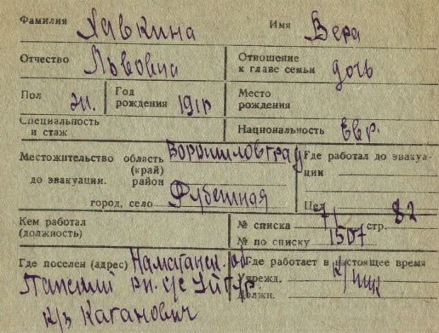 Vera Khavkina was born, 1910 to Lev. Prior to WWII she lived in Rubezhnaya, Ukraine (USSR). During the war she was in Uzbekistan (USSR). Vera was registered following the evacuation/ in the interior of the Soviet Union.