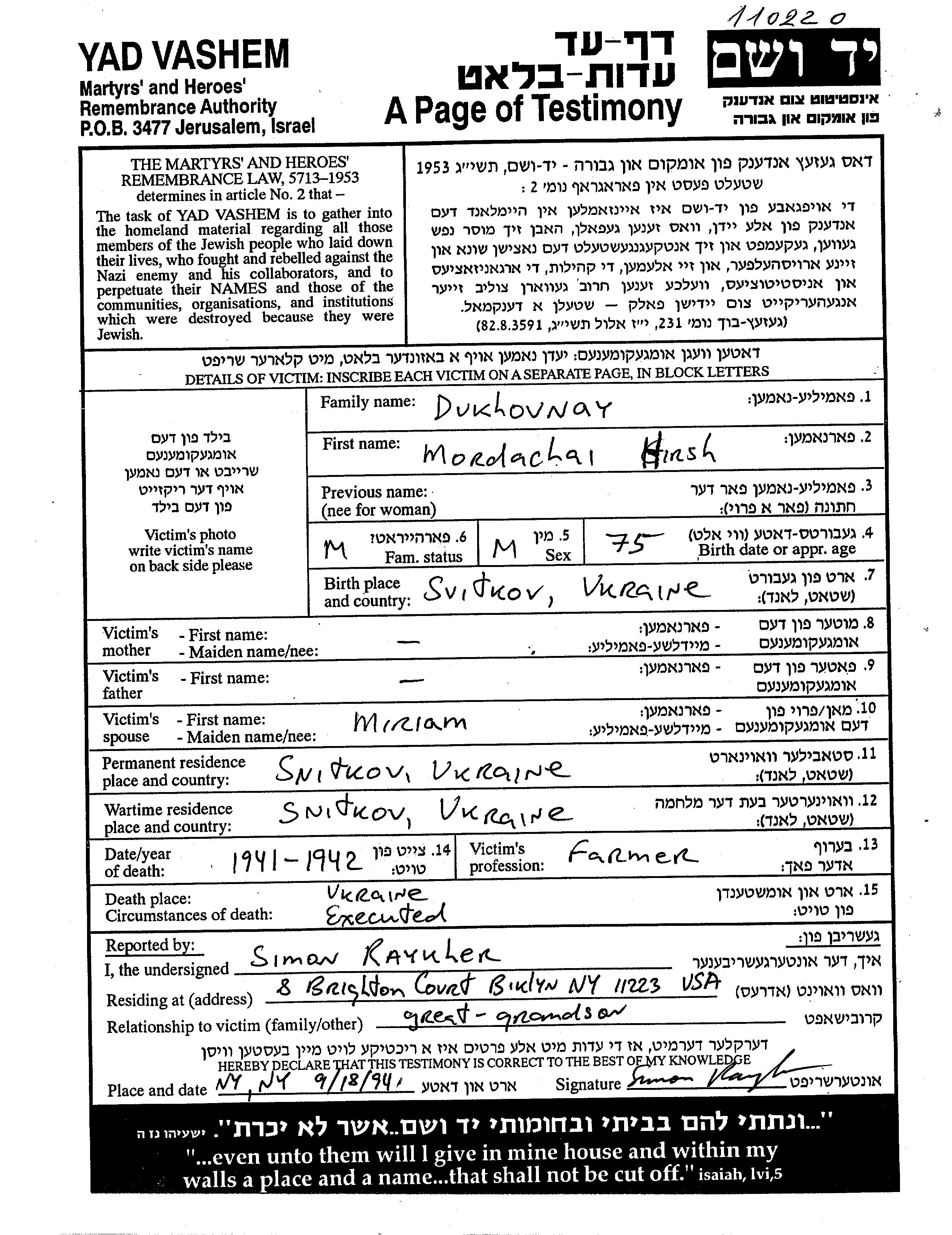 Mordachai Hirsh Dukhovnay was born in Snitkov, Ukraine (USSR), 1867. He was a farmer and married to Miriam. Prior to WWII he lived in Snitkov, Ukraine (USSR). During the war he was in Snitkov, Ukraine (USSR). Mordachai Hirsh was murdered in the Shoah. Place of death: Ukraine (USSR), 1941.