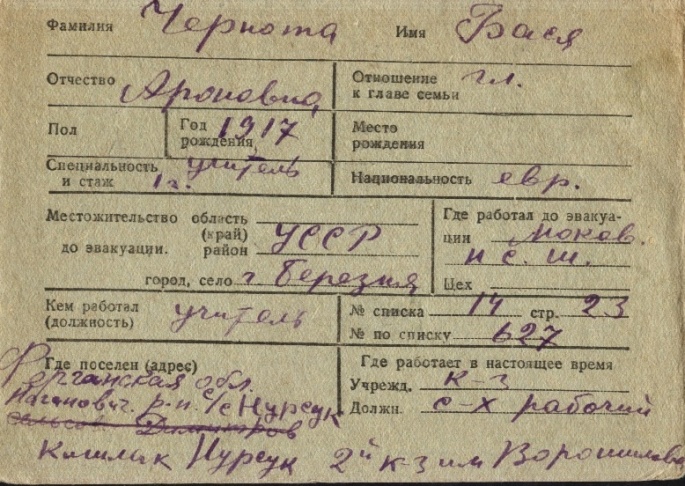 Basya was registered following the evacuation/ in the interior of the Soviet Union.