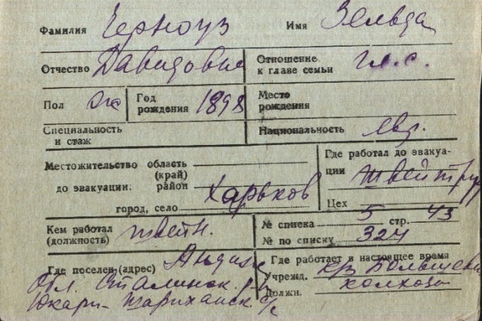 Zelda Chernouz was born, 1898 to David. Prior to WWII she lived in Kharkov, Ukraine (USSR). During the war she was in Uzbekistan (USSR). Zelda was registered following the evacuation/ in the interior of the Soviet Union.