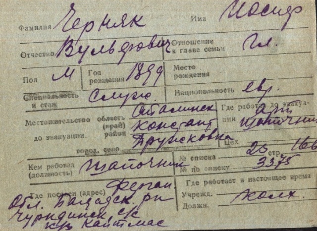 Iosif Chernyak was born, 1899 to Vulf. Prior to WWII he lived in Druzhkovka, Ukraine (USSR). During the war he was in Uzbekistan (USSR). Iosif was registered following the evacuation/ in the interior of the Soviet Union.