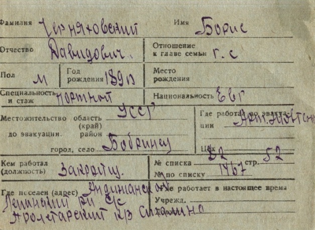 Boris Chernyakhovskiy was born, 1890 to David. Prior to WWII he lived in Bobrinets, Ukraine (USSR). During the war he was in Uzbekistan (USSR). Boris was registered following the evacuation/ in the interior of the Soviet Union.