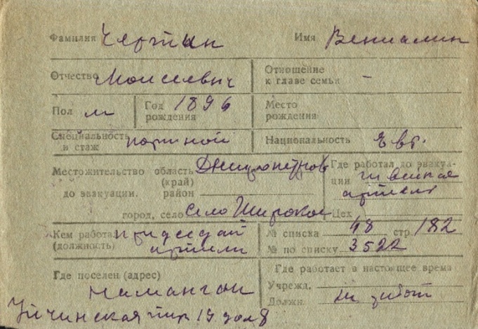 Veniamin Chertin was born, 1896 to Moisey. Prior to WWII he lived in Shirokoye, Ukraine (USSR). During the war he was in Uzbekistan (USSR). Veniamin was registered following the evacuation/ in the interior of the Soviet Union.