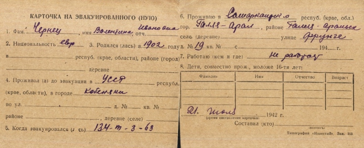 Valentina Chernetz was born, 1902 to Ivan. Prior to WWII she lived in Kobelyaki, Ukraine (USSR). During the war she was in Uzbekistan (USSR). Valentina was registered following the evacuation/ in the interior of the Soviet Union.