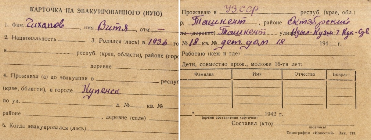 Vitya Chikhapov was born, 1936. He was child. Prior to WWII he lived in Kupyansk, Ukraine (USSR). During the war he was in Uzbekistan (USSR). Vitya was registered following the evacuation/ in the interior of the Soviet Union.