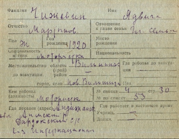 Yadviga Chizhevin was born, 1920 to Martyn. Prior to WWII she lived in Novaya Vilnya, Poland. During the war she was in Uzbekistan (USSR). Yadviga was registered following the evacuation/ in the interior of the Soviet Union.