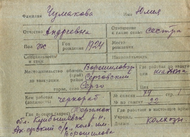 Yuliya Chumakova was born, 1924 to Andrey. Prior to WWII she lived in Sergo, Ukraine (USSR). During the war she was in Uzbekistan (USSR). Yuliya was registered following the evacuation/ in the interior of the Soviet Union.
