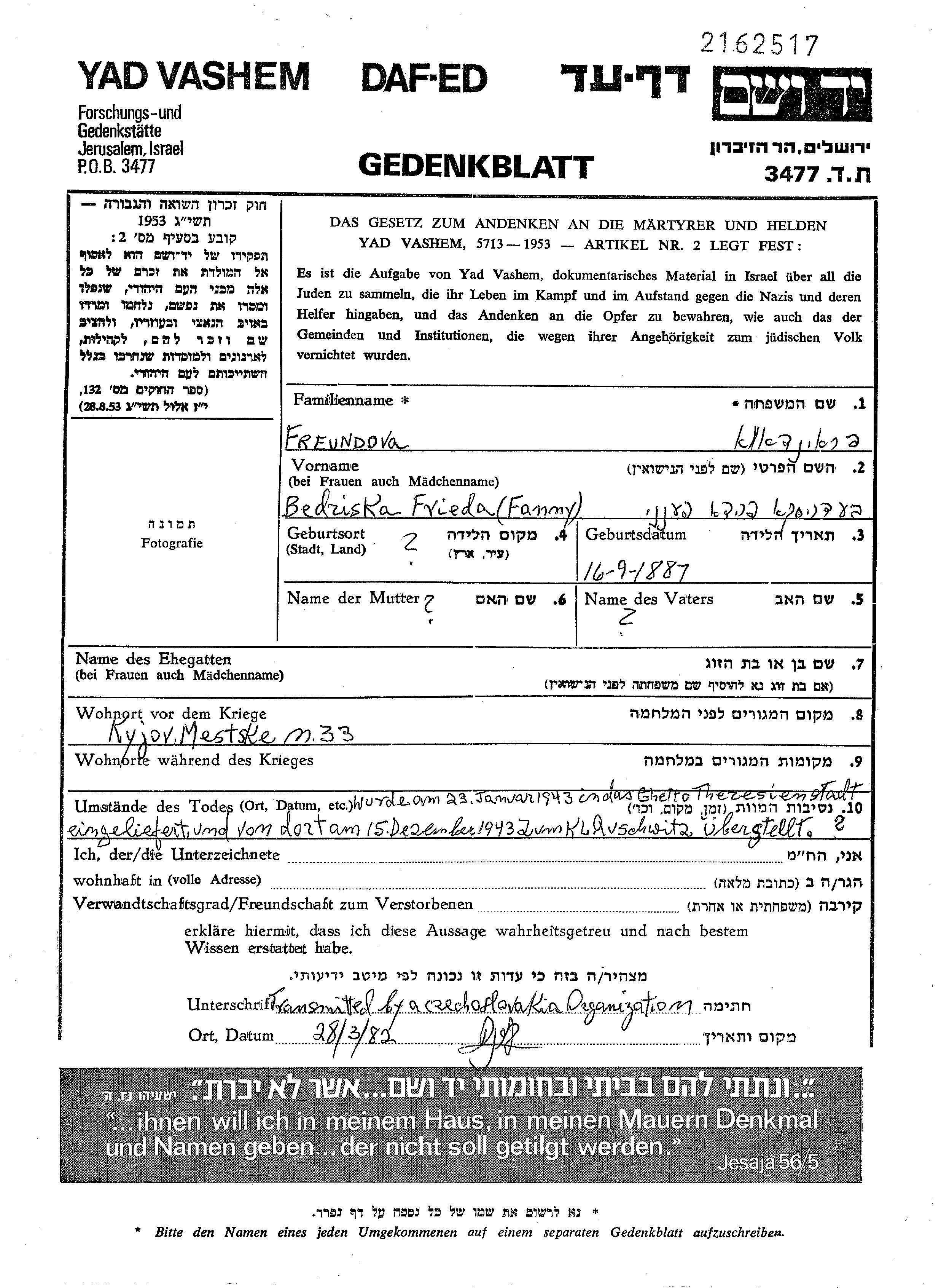Frieda Fanny Bedriska Freundova was born, 1887. Prior to WWII she lived in Kyjov, Czechoslovakia. During the war she was in Kyjov, Czechoslovakia. Frieda Fanny Bedriska was murdered in the Shoah. Place of death: Auschwitz, Poland.