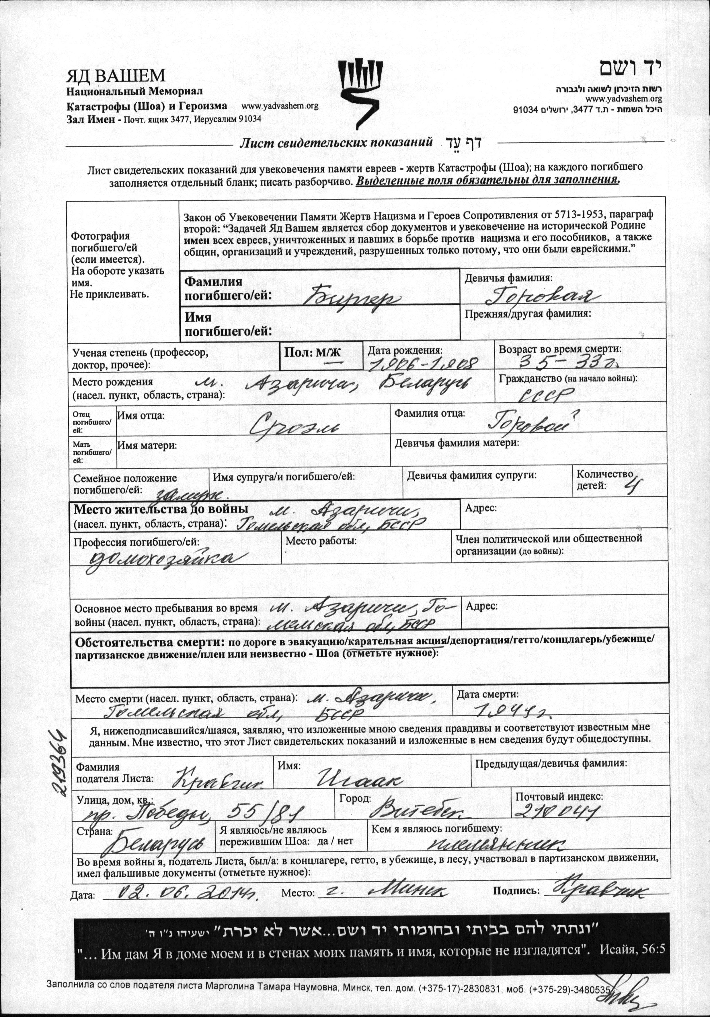 First name unknown Birger nee Gorovaya was born in Azarichi, Belorussia (USSR), 1906 to Sroel. She was a housewife and married. Prior to WWII she lived in Azarichi, Belorussia (USSR). During the war she was in Azarichi, Belorussia (USSR). She was murdered in the Shoah. Place of death: Azarichi, Belorussia (USSR), 1941.