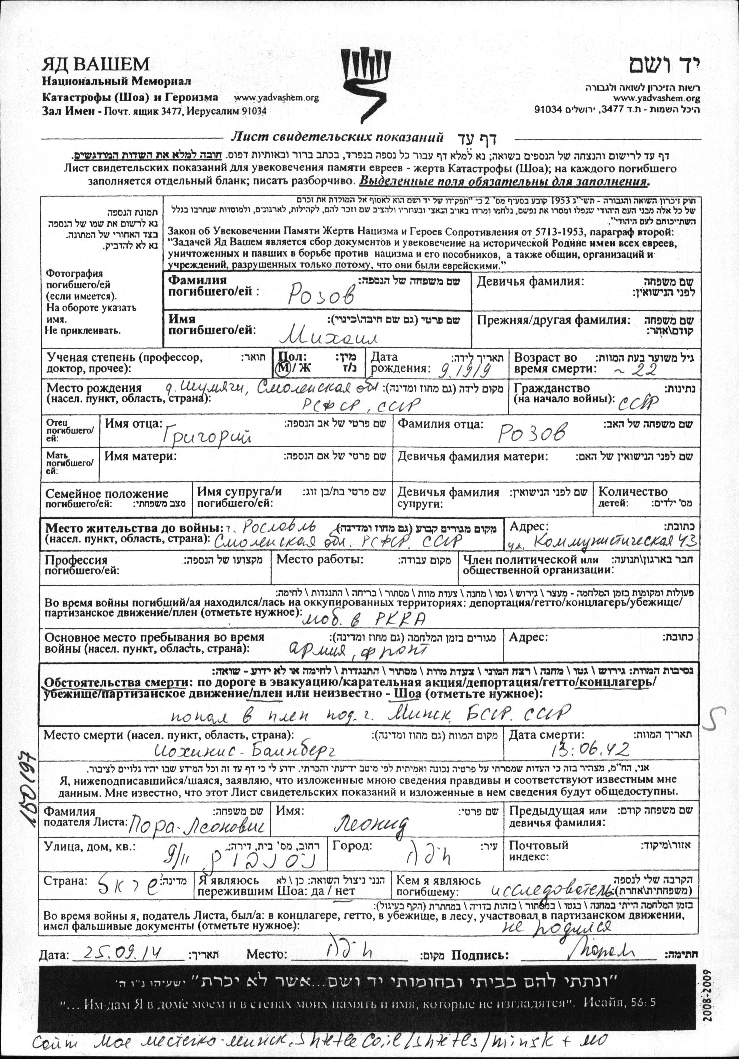 Rozov Mikhail 1919 Roslavl, Russia (USSR) Page of Testimony