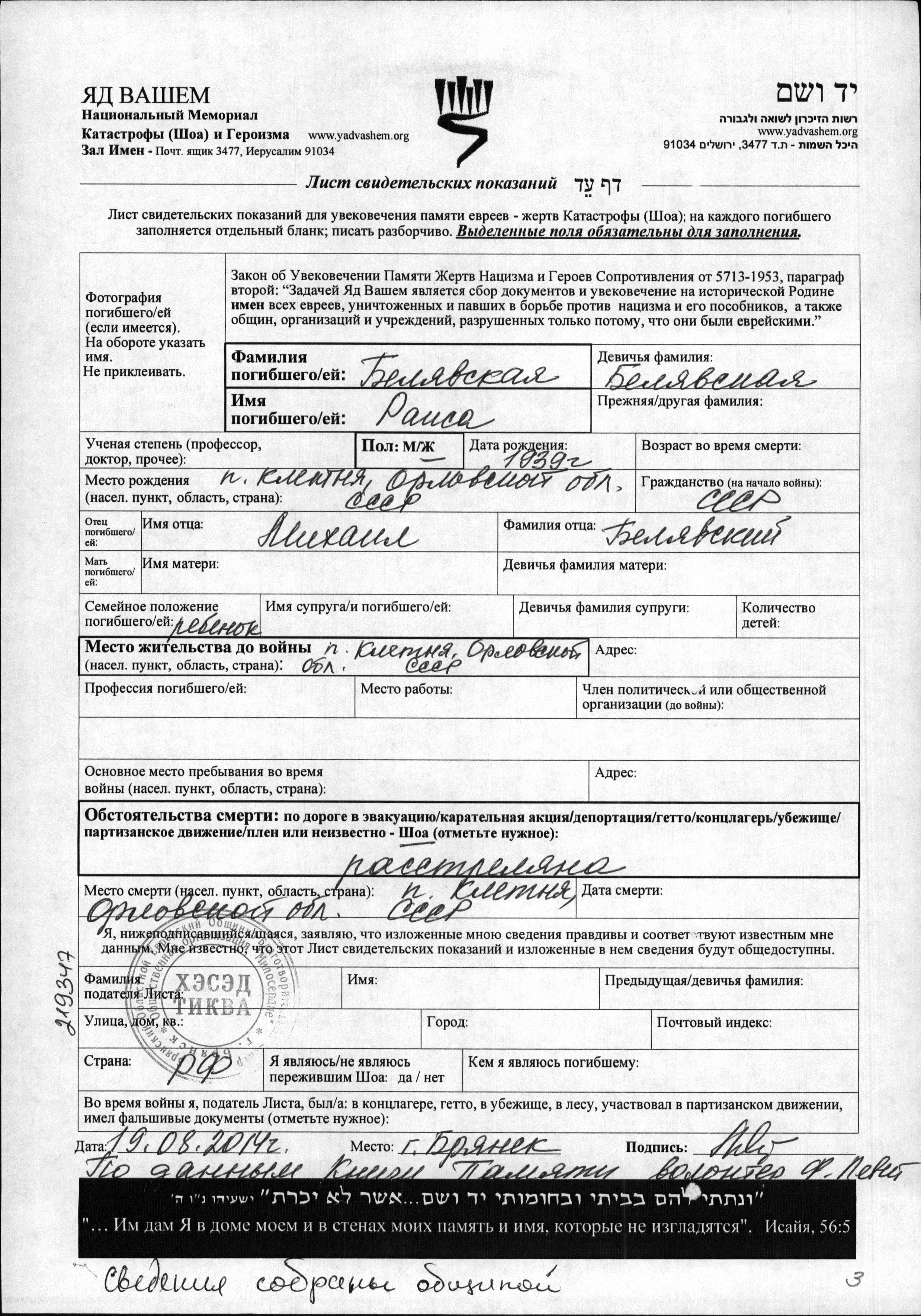 Raisa Belyavskaya was born in Kletnya, Russia (USSR), 1939 to Mikhail. She was child. Prior to WWII she lived in Kletnya, Russia (USSR). During the war she was in Kletnya, Russia (USSR). Raisa was murdered in the Shoah. Place of death: Kletnya, Russia (USSR).