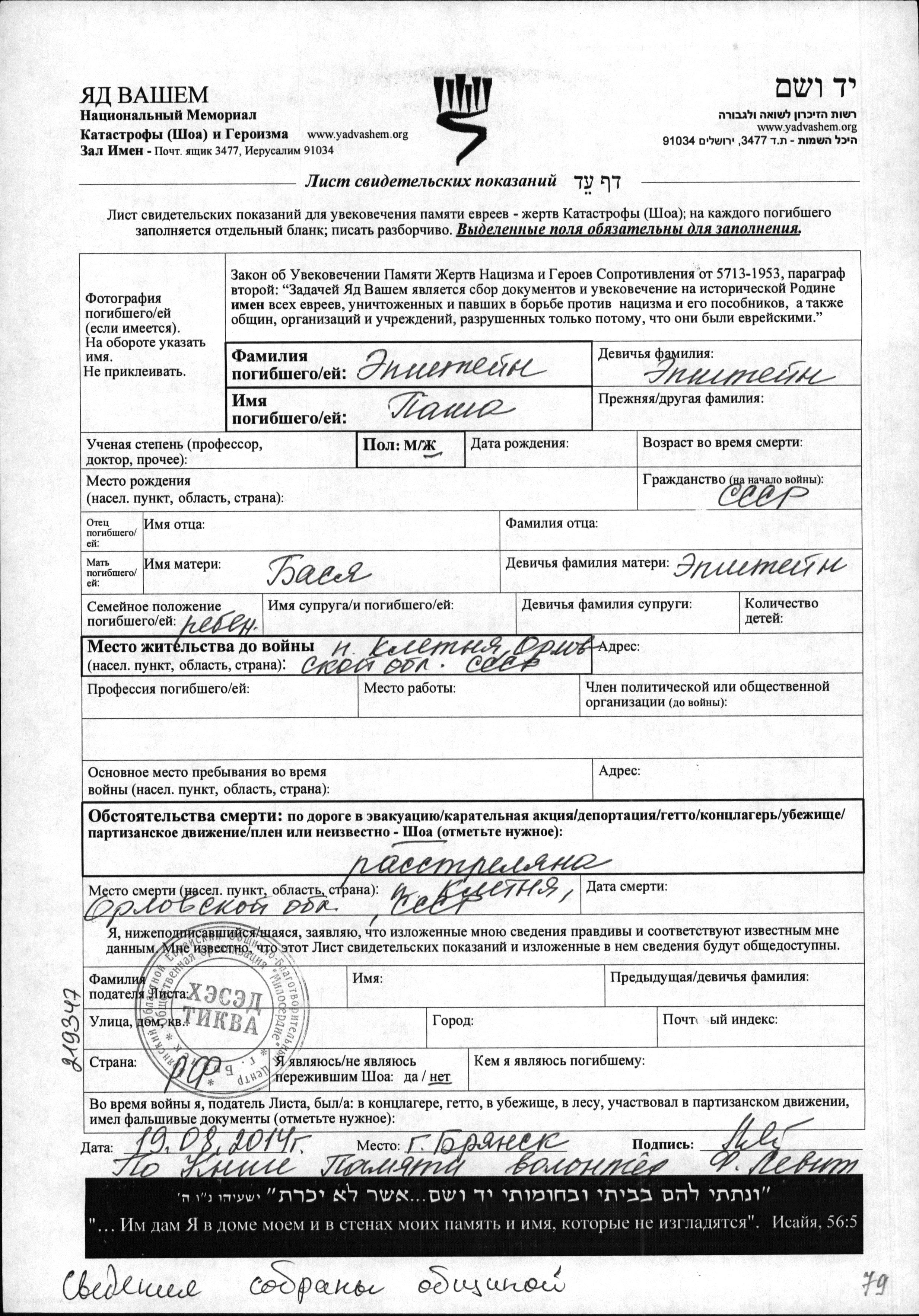 Pasha Epshteyn was born to Basya. She was child. Prior to WWII she lived in Kletnya, Russia (USSR). During the war she was in Kletnya, Russia (USSR). Pasha was murdered in the Shoah. Place of death: Kletnya, Russia (USSR).