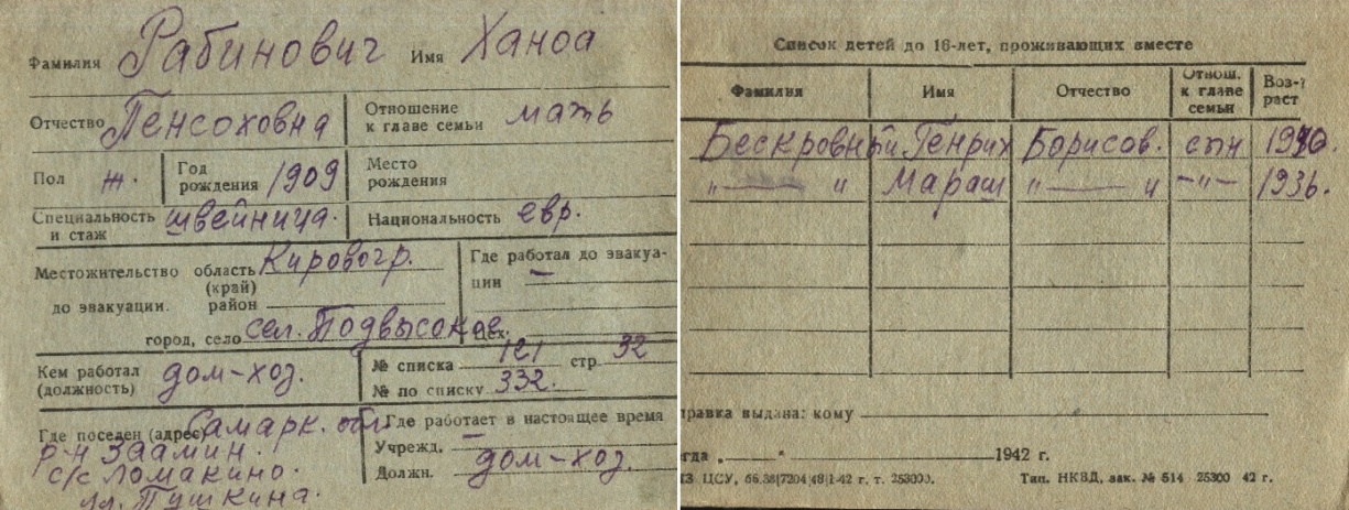 Khanoa Rabinovich was born, 1909 to Pensokh. Prior to WWII she lived in Podvysokoye, Ukraine (USSR). During the war she was in Uzbekistan (USSR). Khanoa was registered following the evacuation/ in the interior of the Soviet Union.