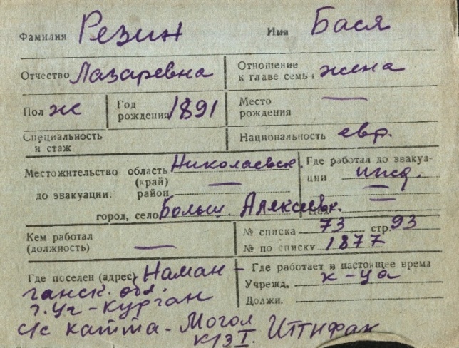 Basya Rezin was born, 1891 to Lazar. Prior to WWII she lived in Bolshaya Aleksandrovka, Ukraine (USSR). During the war she was in Uzbekistan (USSR). Basya was registered following the evacuation/ in the interior of the Soviet Union.