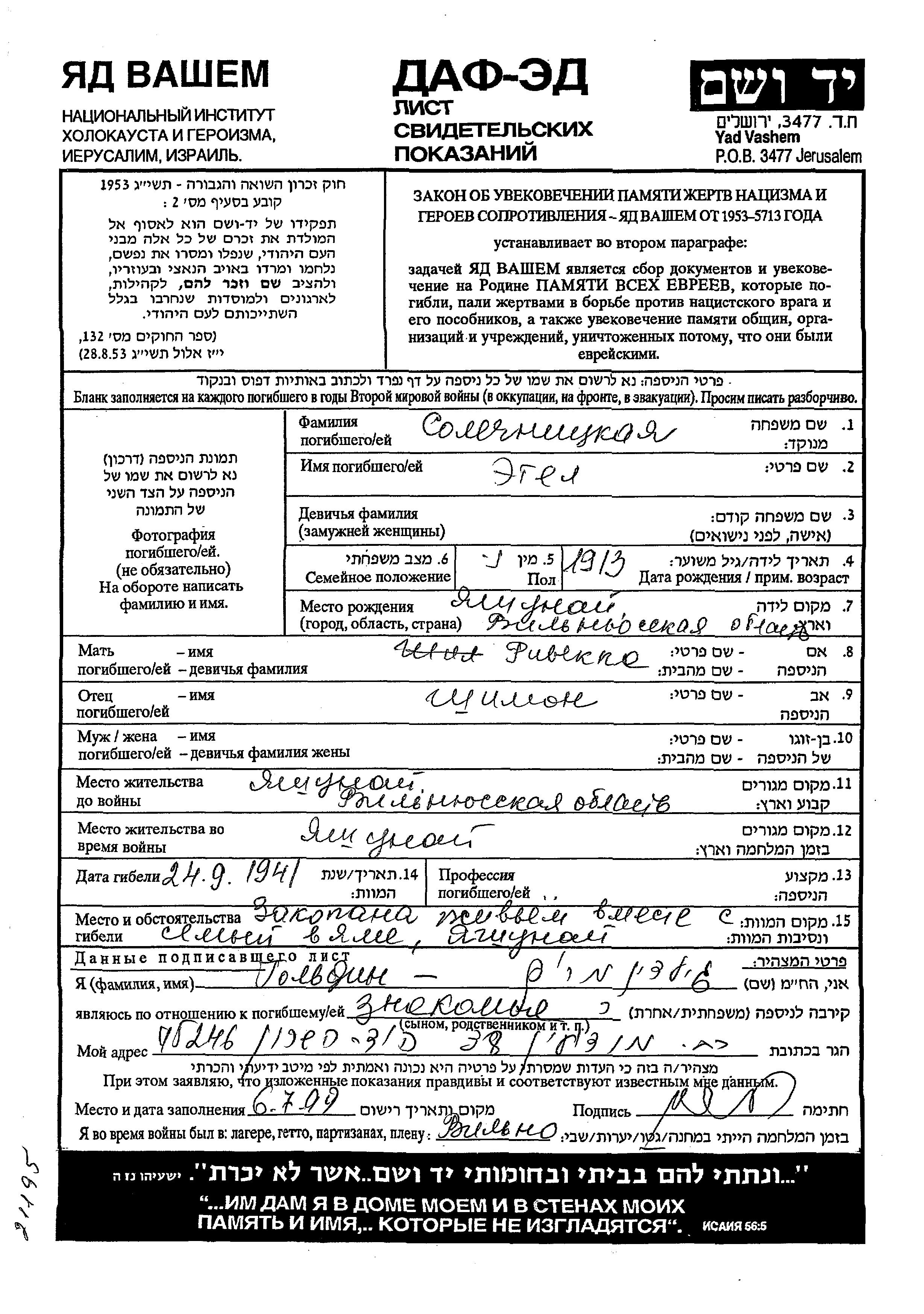 Etel Solechnitzki was born in Jashun, Poland, 1913 to Shimon and Rivekka. Prior to WWII she lived in Jashun, Poland. During the war she was in Jashun, Poland. Etel was murdered in the Shoah. Place of death: Jashun, Poland, 1941.