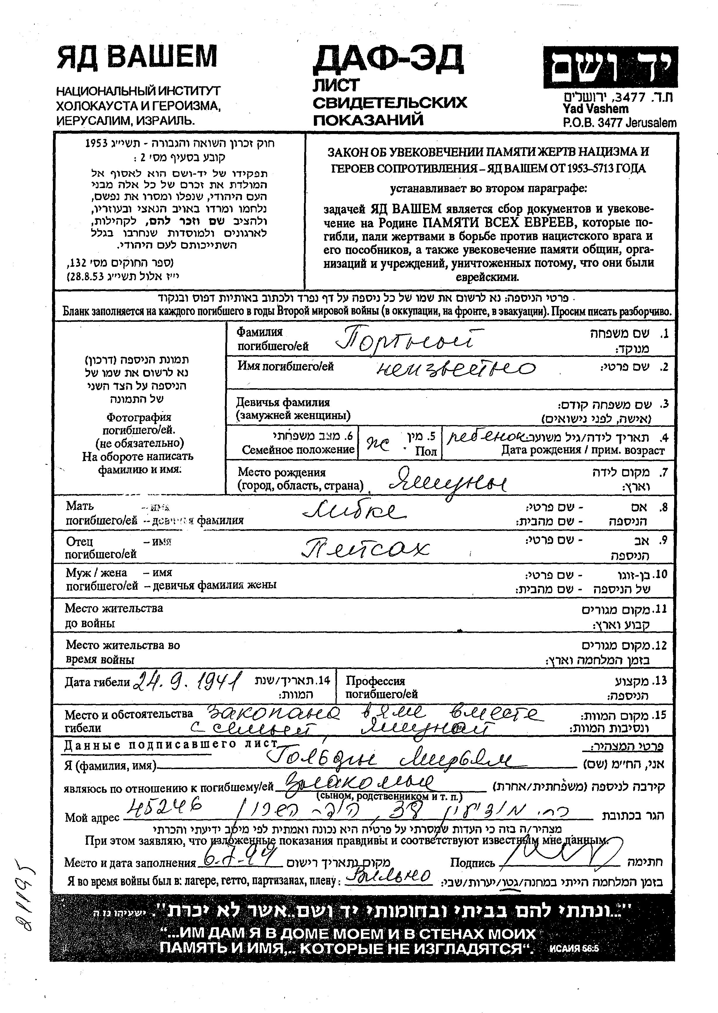First name unknown Portnoi was born in Jaszuni, Poland to Peisakh and Libke. He was child. Prior to WWII he lived in Jaszuni, Poland. During the war he was in Jaszuni, Poland. He was murdered in the Shoah. Place of death: Jaszuni, Poland, 1941.