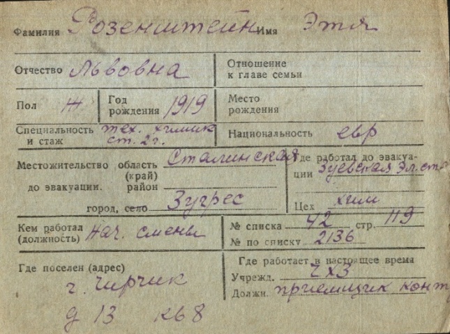 Etya Rozenshteyn was born, 1919 to Lev. Prior to WWII she lived in Zugres, Ukraine (USSR). During the war she was in Uzbekistan (USSR). Etya was registered following the evacuation/ in the interior of the Soviet Union.