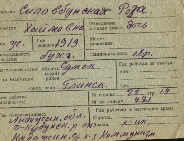 Roza Silovbunskaya was born, 1919 to Khaim. Prior to WWII she lived in Glinsk, Ukraine (USSR). During the war she was in Uzbekistan (USSR). Roza was registered following the evacuation/ in the interior of the Soviet Union.