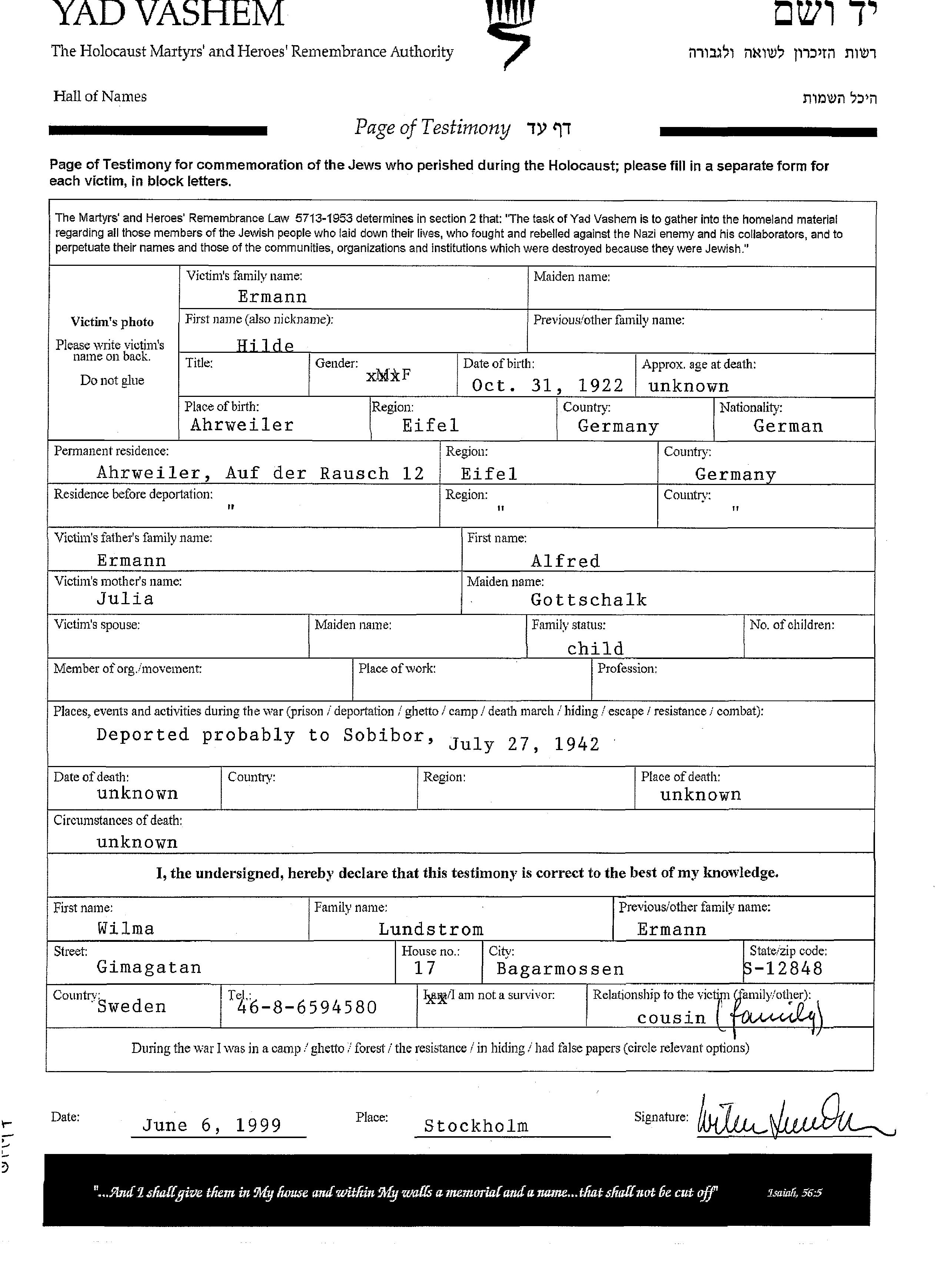 Ermann Hilde 1922 Ahrweiler, Germany Page of Testimony