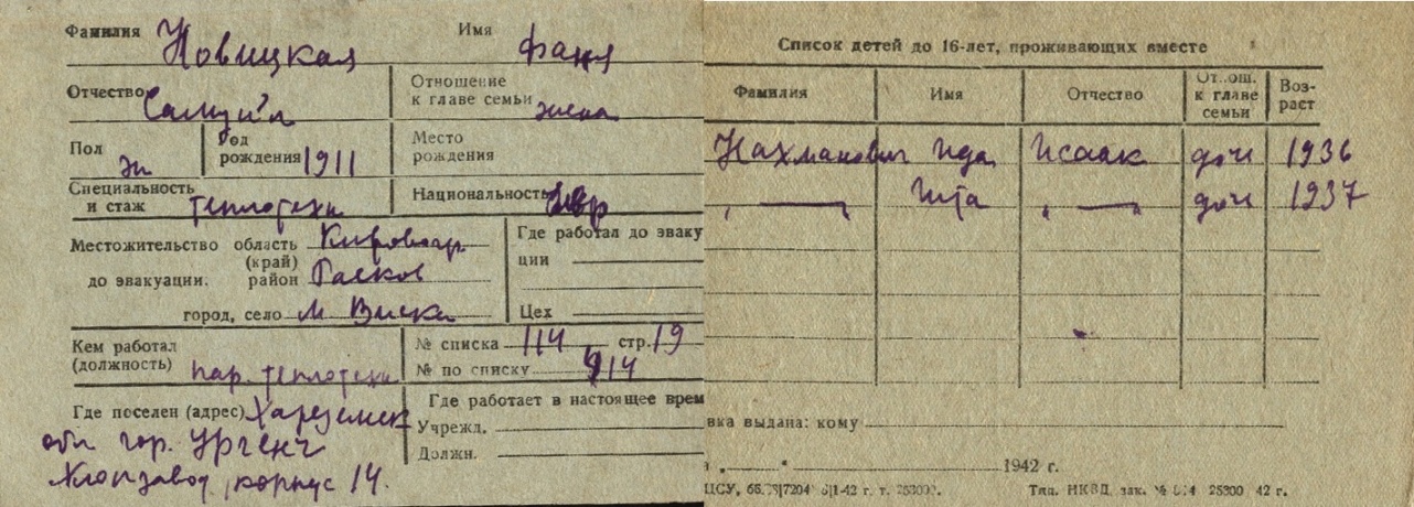 Fanya Novitzkaya was born, 1911 to Samuil. Prior to WWII she lived in Malaya Viska, Ukraine (USSR). During the war she was in Uzbekistan (USSR). Fanya was registered following the evacuation/ in the interior of the Soviet Union.